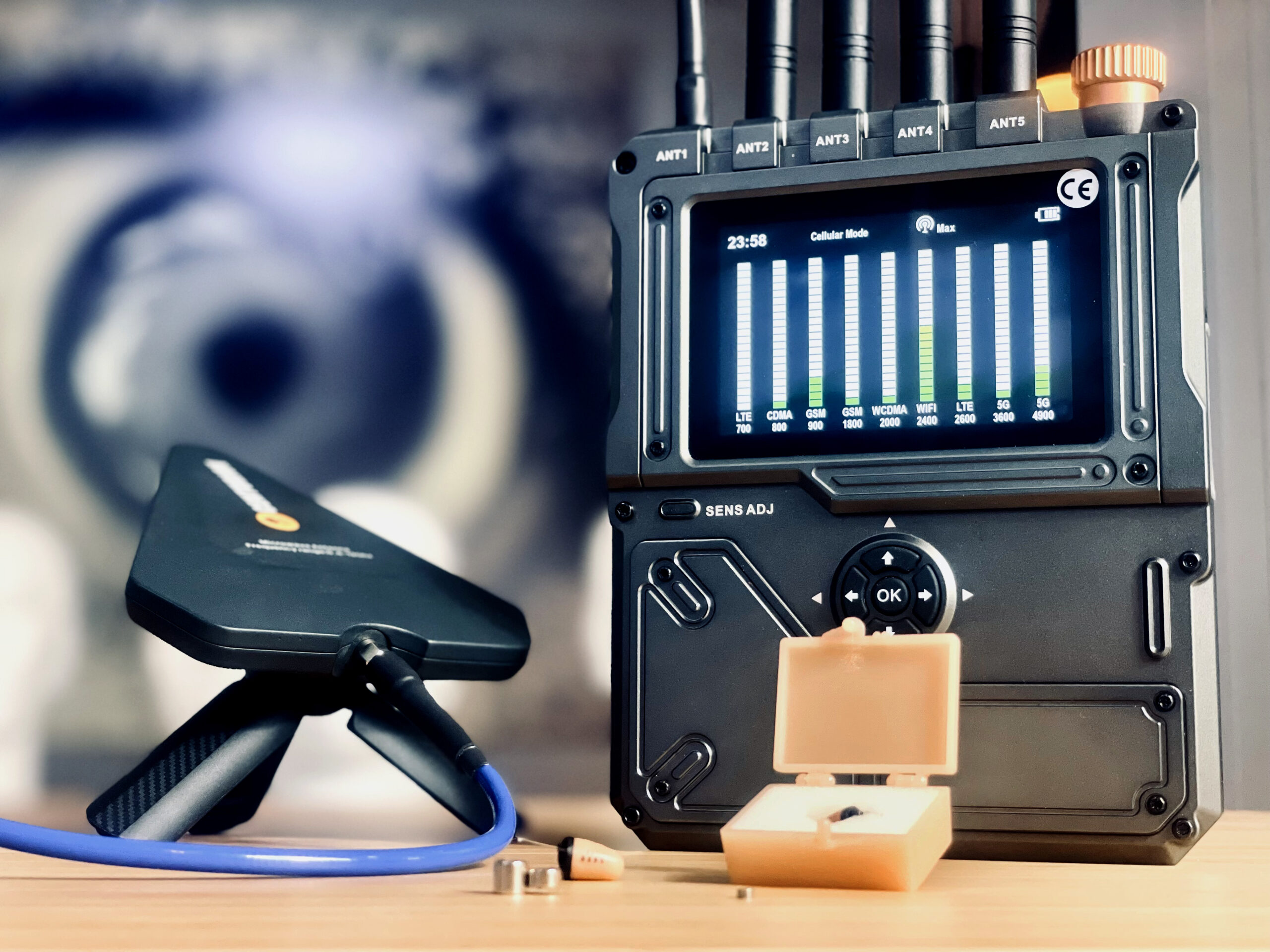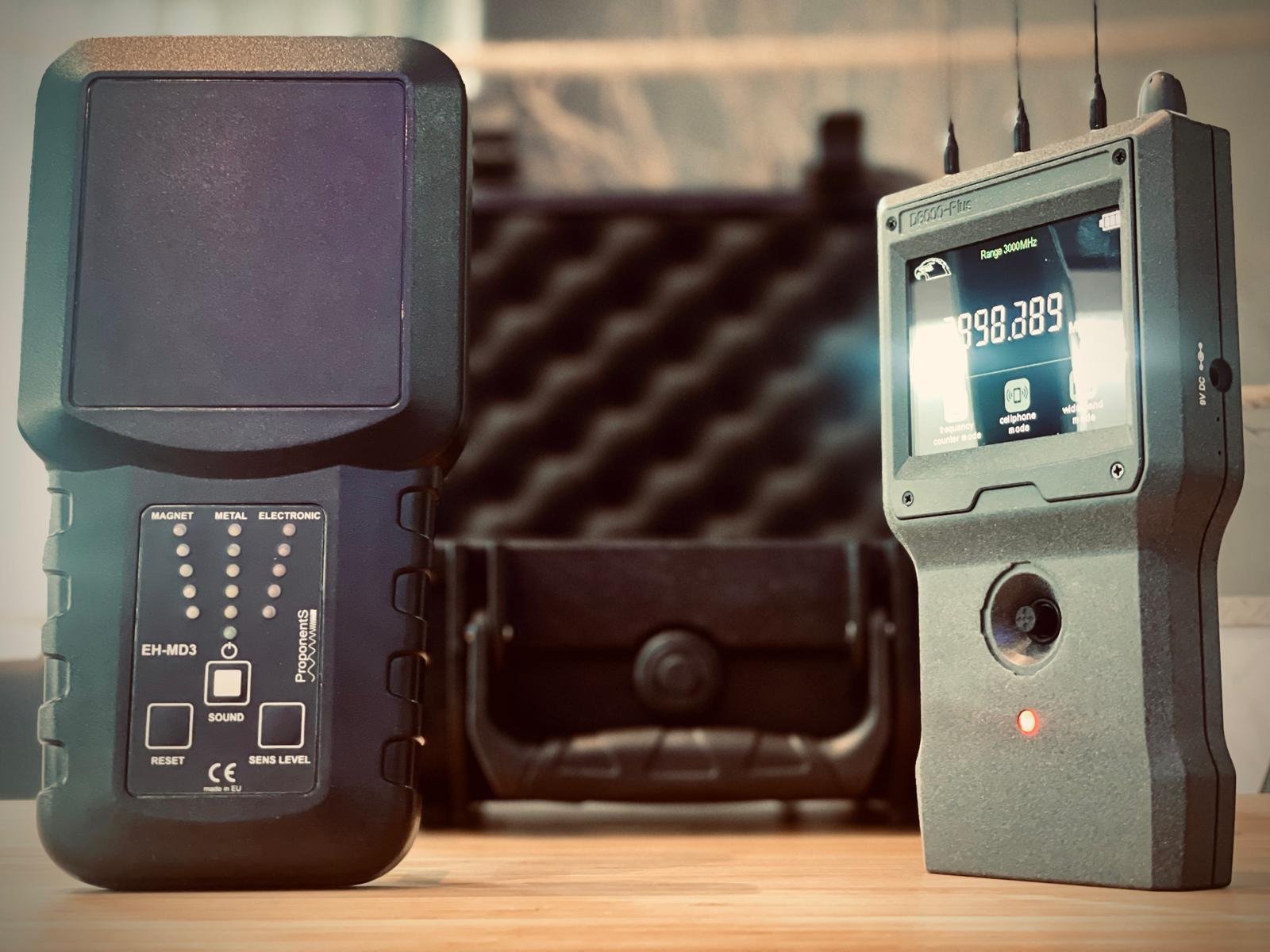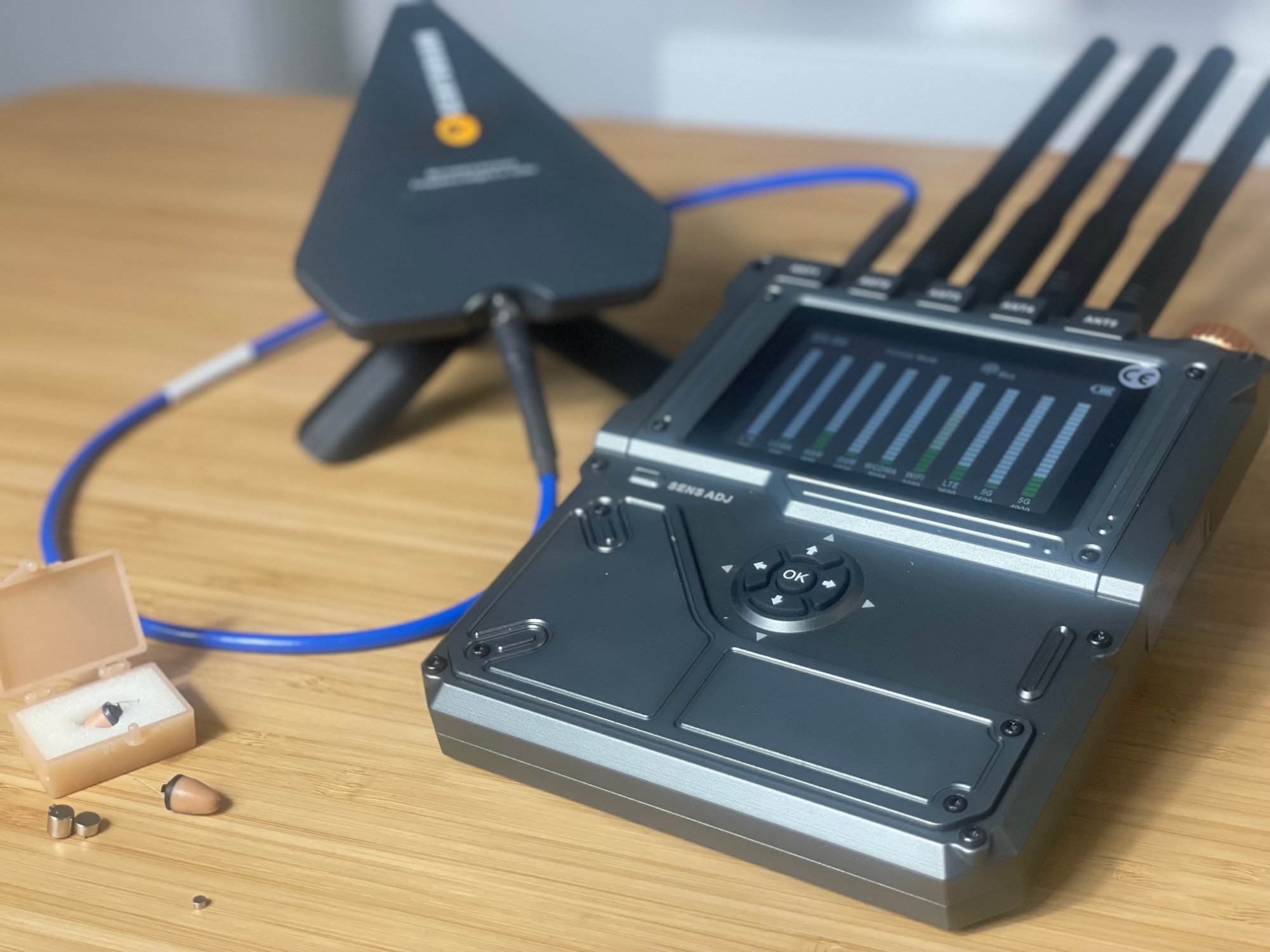 Localice cámaras, micrófonos, pinganillos y transmisores ocultos en tiempo real aunque estén apagados.
